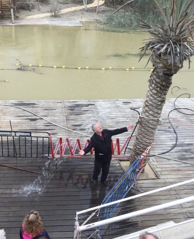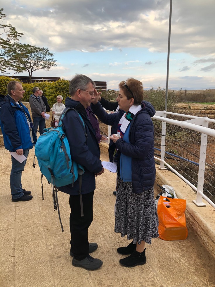 This afternoon we visited the site of the baptism of Jesus where we were able to renew our baptism vows and (as you can see from the photo) some of us chose to get wet. Because the level of the river was so high, we weren’t allowed nearer, but we could chose to stand under a spray being pumped from the river.
