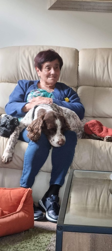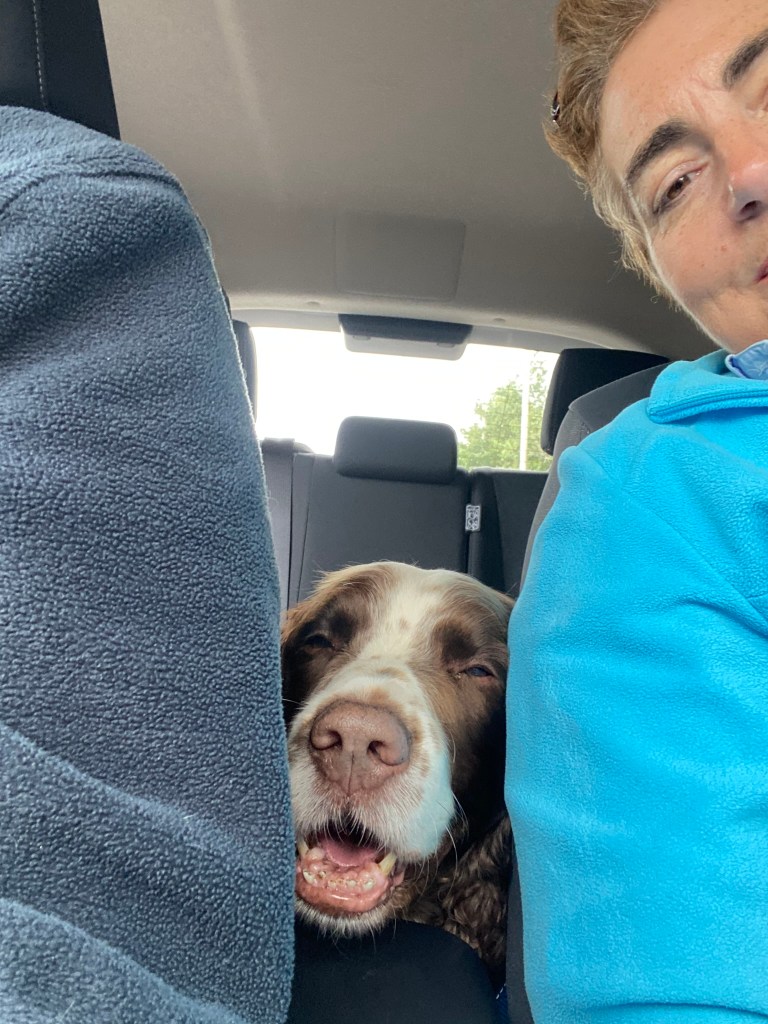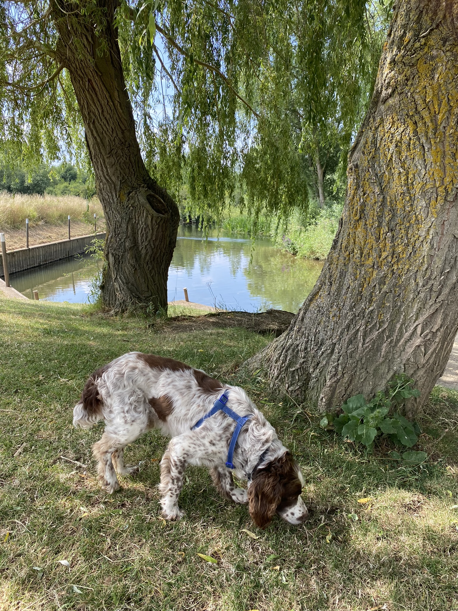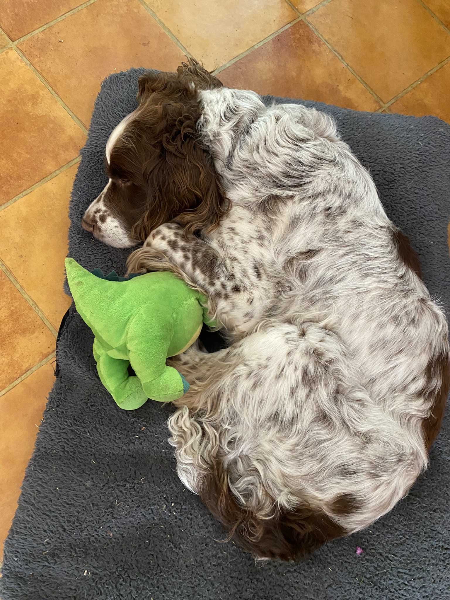 Bobby loved walks, he loved his Nan and all his humans. He loved his green dino, drinking from muddy puddles, sleeping on sofas or sleeping anywhere really. He came to love the car so long as he got to be in the ‘driver’ seat between us. He loved the open fields and the especially the stream which he visited every day. He wasn’t at all keen on boats so we didn’t do that again.